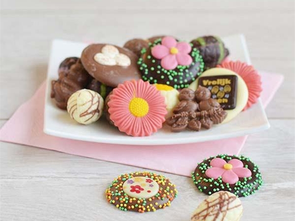 Bij Pasen hoort natuurlijk paaschocolade. Al onze chocoladeproducten komen uit onze eigen chocolaterie. Het bestaat uit een mix fleurige witte, melk- en pure paaschocolade, geleverd in een koker.