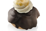 Grote soes, gedoopt in de chocoladefondant en gevuld met slagroom. Gedecoreerd met fruit. Een verwenmoment voor de chocoladeliefhebber.
